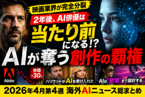 この1週間の動きを俯瞰すると、クリエイティブAIは明確に**「実験段階から運用段階」へ移行した**といえます。 特に重要なのは以下の3点です: ① AIが「代替」ではなく「拡張」に寄ってきている AI俳優の事例は象徴的で […]